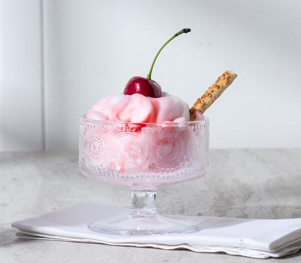 Tiny but full of personality, this clear glass bowl features a charming embossed circle pattern and petite pedestal. It’s the perfect dish for icecream, fruit, individual trifles, or pudding.